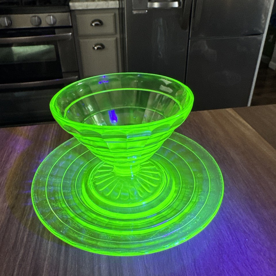 Vintage Uranglas Dessertschale mit Fuß und Untertasse getäfelt Optik. Wunderschön!