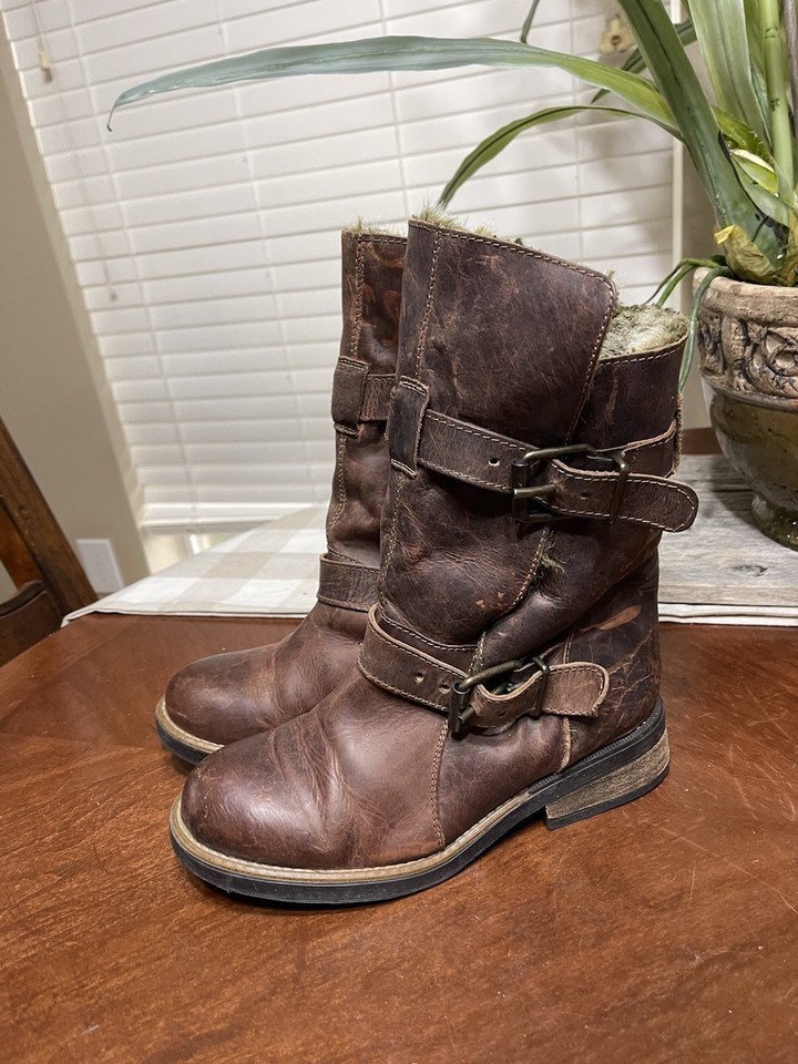 Steve Madden Caveat Damen-Bikersti efel braun Leder abgenutzt Kunstfell 7,5