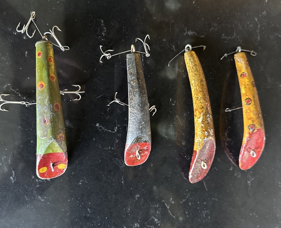 Lot Of 4 Vintage Helin Flatfish Wood Hand Painted Fishing Lures 5” - 6”
