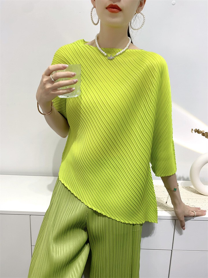 Sommer Plissee Tops Damen unregelmäßig T-Shirt diagonaler Saum bequem Freizeit