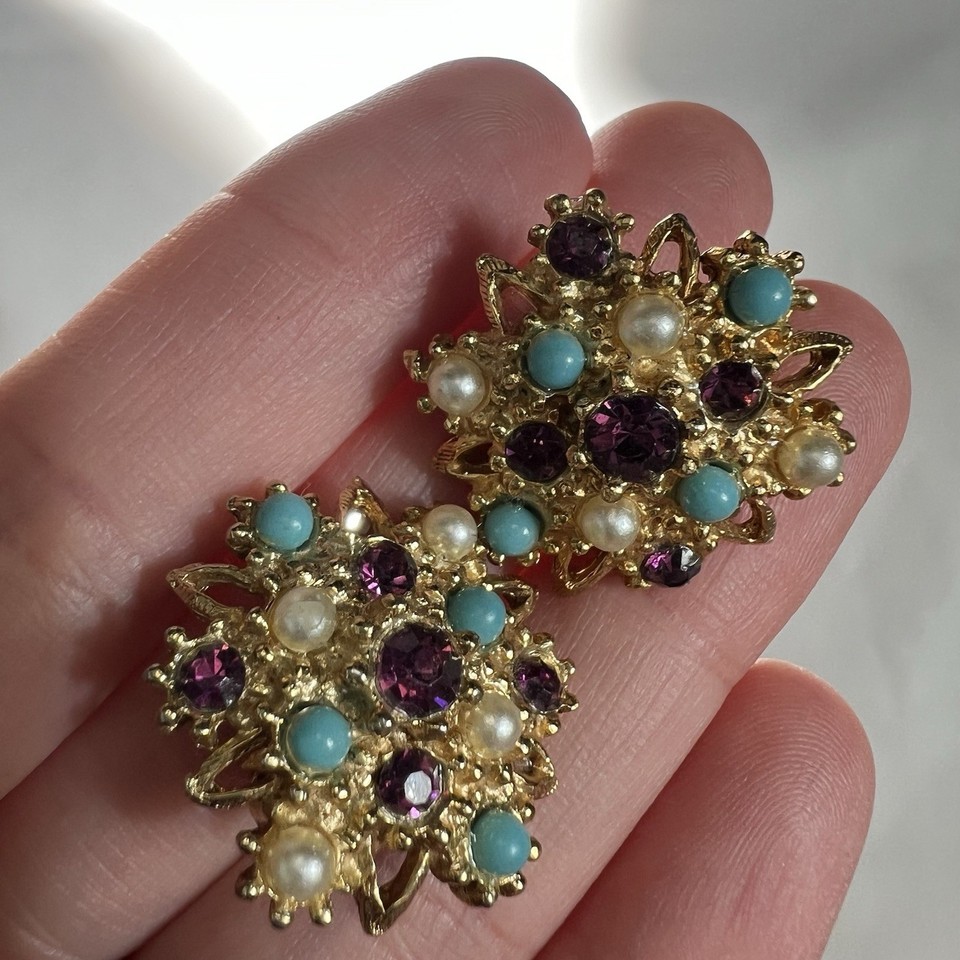 Vintage Faux Pearl Turquoise Rhinestone Gold Tone Costume Estate Earrings