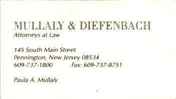 1980er Mullaly & Diefenbach Anwaltskanzlei Visitenkarte Paula A Mullaly Pennington NJ