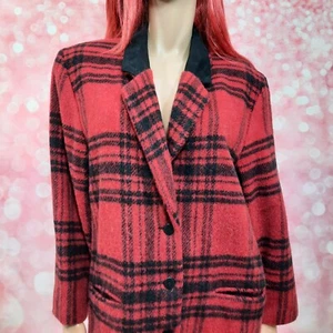 Vintage 80s Woolrich Red Plaid Jacket Wool Mohair Size M Black Suede Collar