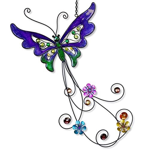 Hängender Schmetterling Dekor Glas Sonnenfänger Fenster Metall Blume lila 15" lang