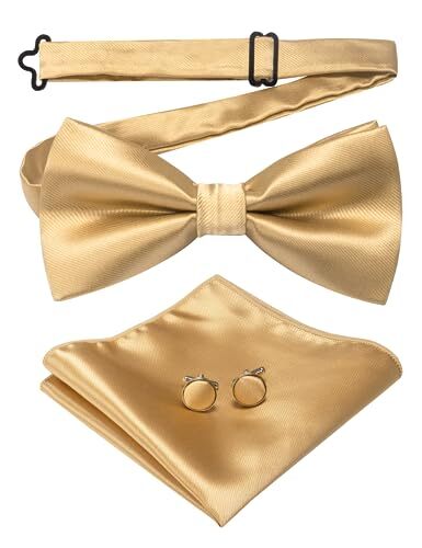 Mens Solid Color Pre-tied Bow Tie and Pocket Square Cufflink Set Gold
