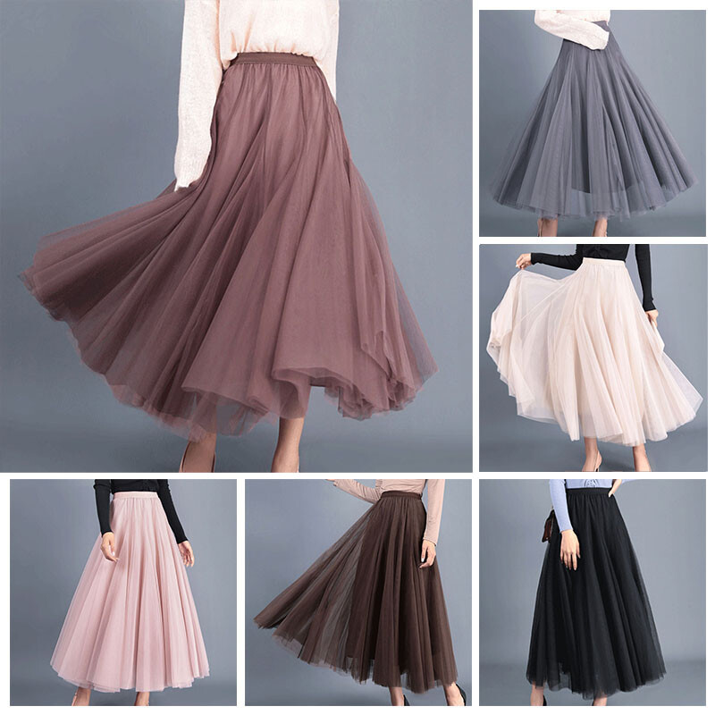 Damen Elegant Netz Tüll Lagenlook Tutu Rock Plissee Party Damen Maxi Langes Kleid
