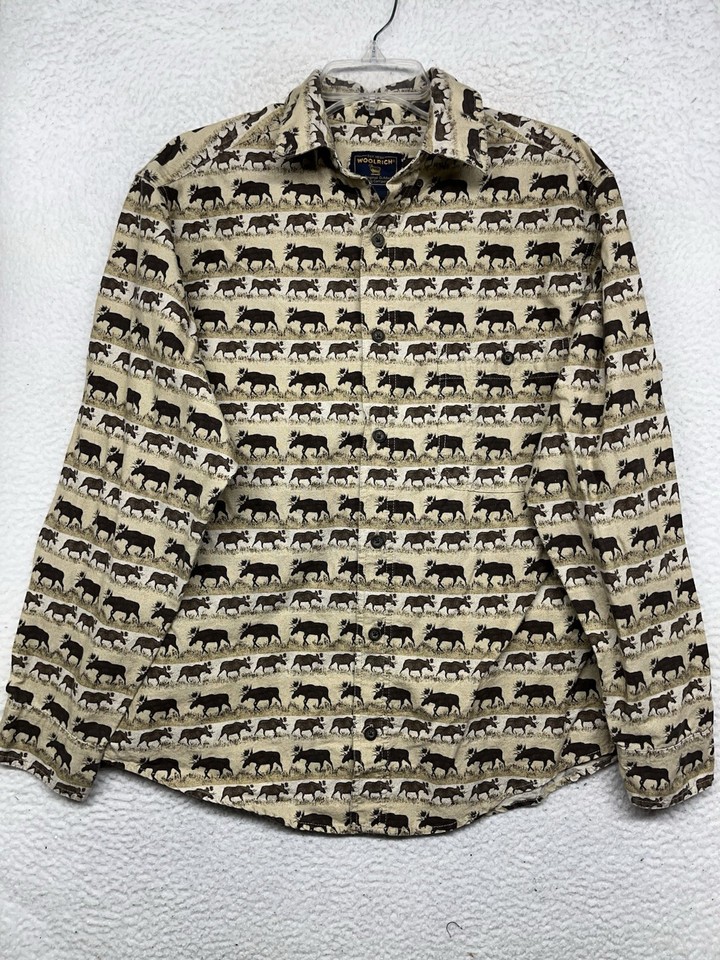 Vintage Woolrich Button Shirt Herren Medium Beige Elch All Over Print