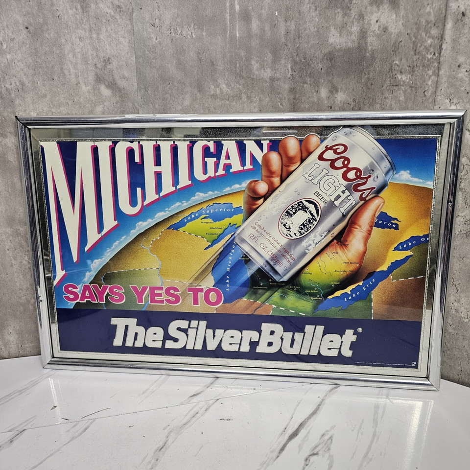 Vintage '92 Coors Light Beer Silver Bullet Michigan Mirror Bar Sign Man Cave