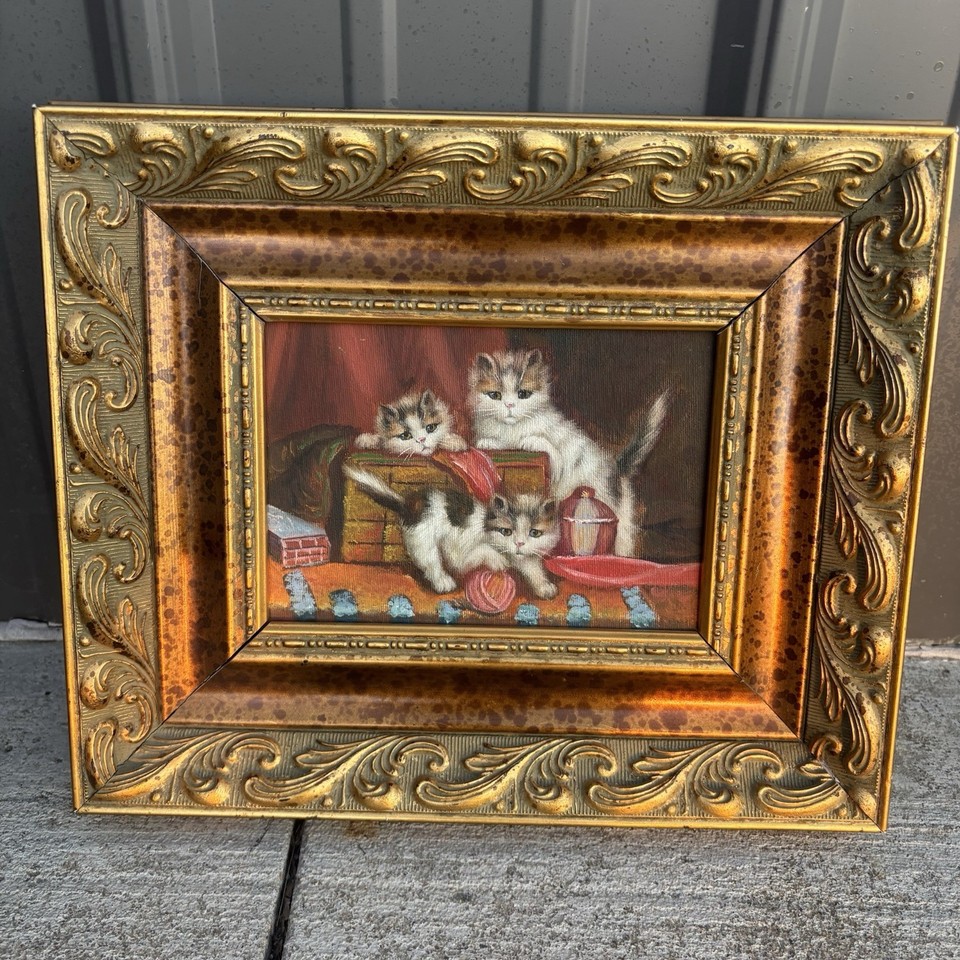 Verspielte Kätzchen Katzen - verziertes gerahmtes Vintage Ölgemälde 5x7 Rahmen 10x12