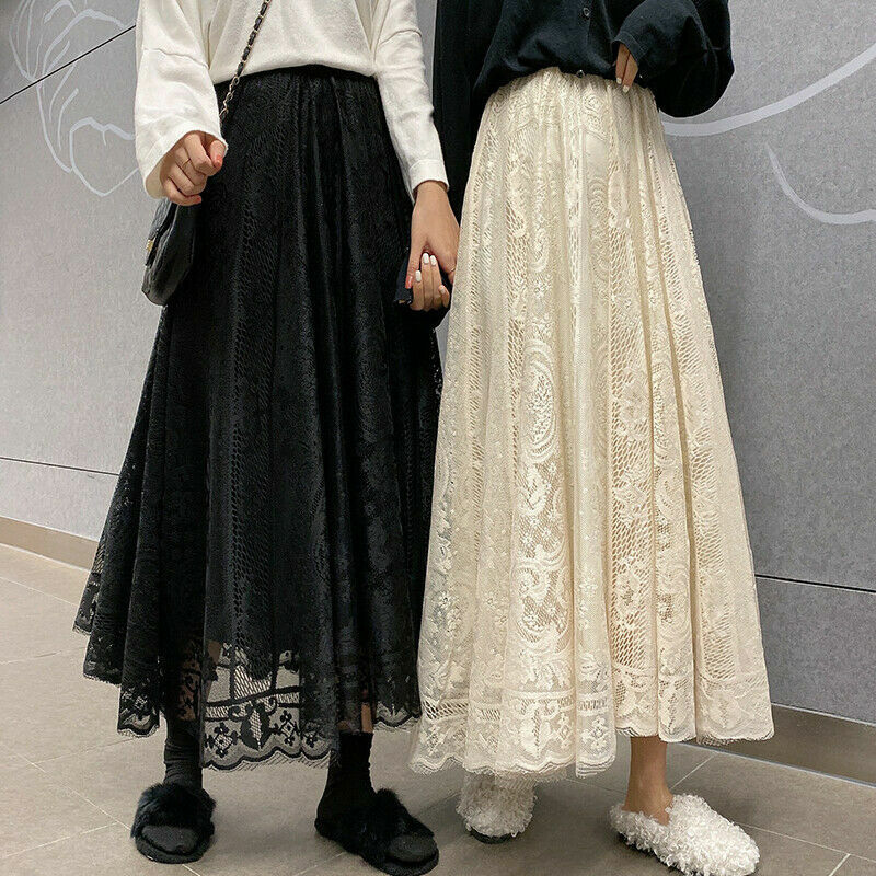 Women Spring Summer Skirt Waist Lace Skirts Black Apricot Long Maxi Skirts