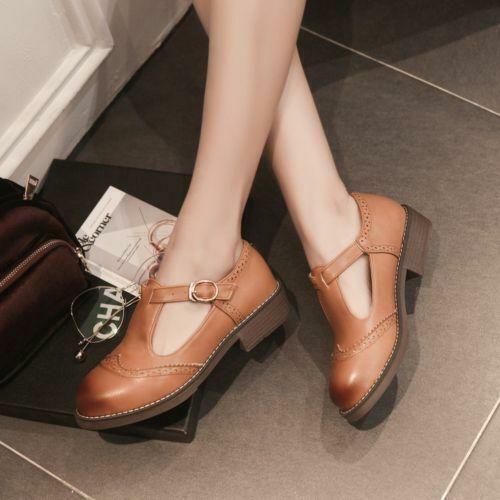 Oxford Damen Brogue Pump College runde Zehenpartie T-Riemen Mary Jane Flügelspitze Schuhe