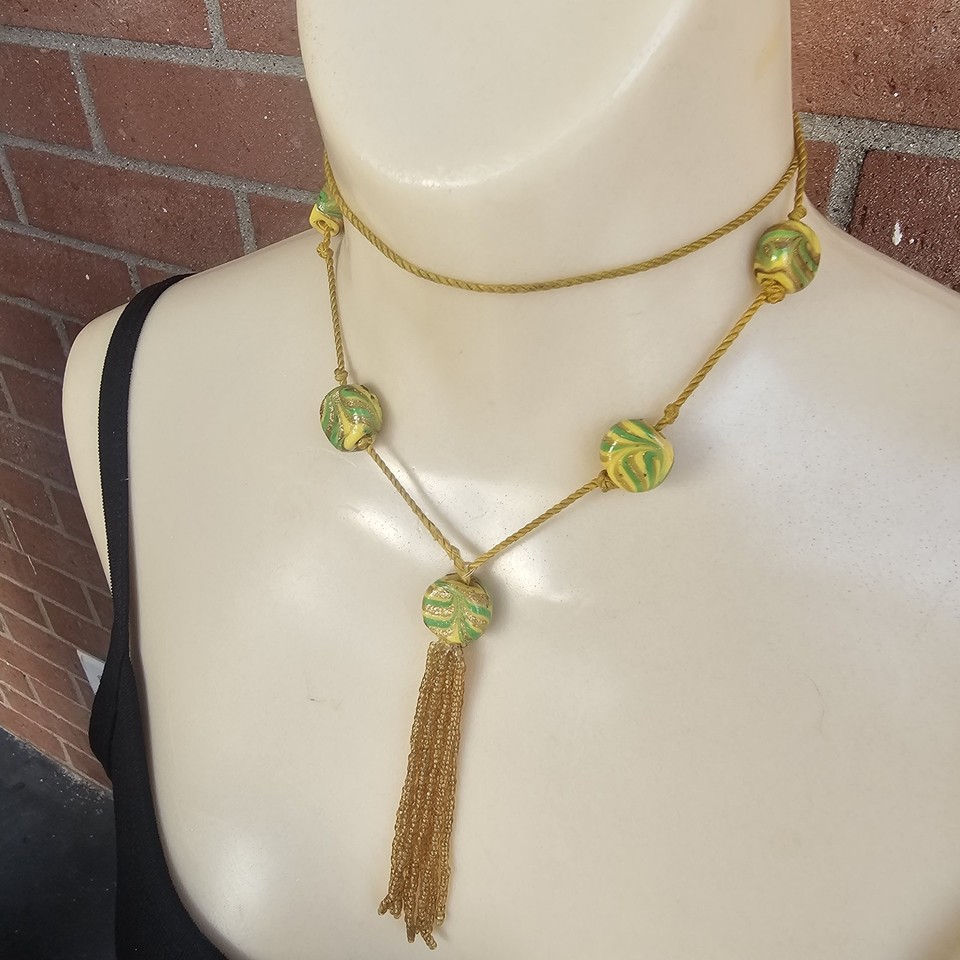 Vintage Keramik Glasperlen Halskette am Seil Rocailles Quaste 24" +5" grün gelb