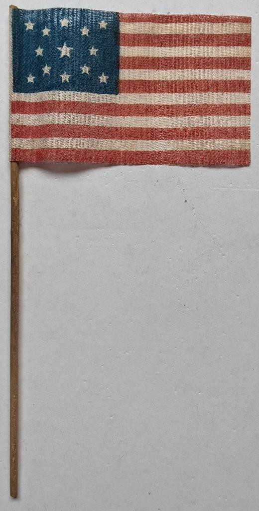 c 1876 OLD VINTAGE 13 STAR CENTENNIAL U.S. AMERICAN PARADE FLAG on Wooden Stick