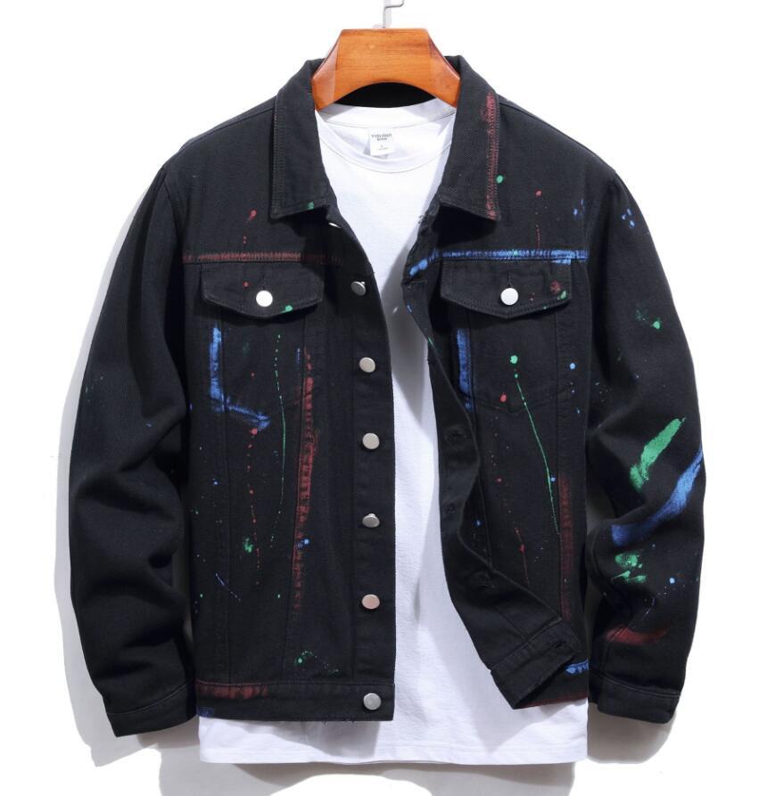 Men's Black Denim Jean Jacket Printed Button Basic Coat Punk Hip Hop Colorful