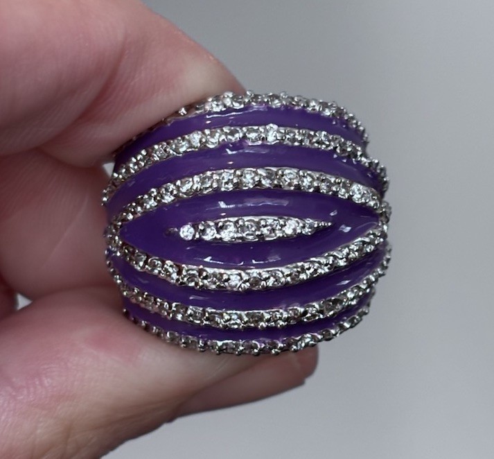 Rhodium, Designer Inspired Purple Enamel Crystals Beautiful Vintage Ring.