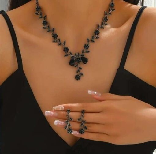 Braut Abschlussball Halskette Set Kristall Schwarz Blume Ohrringe Elegant Schmuckset