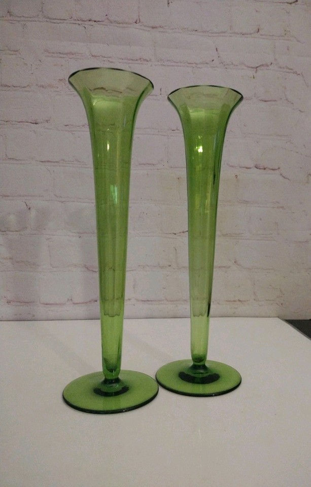 Vintage Pair of Green Glass Tall Footed Vases 9.5" Tall