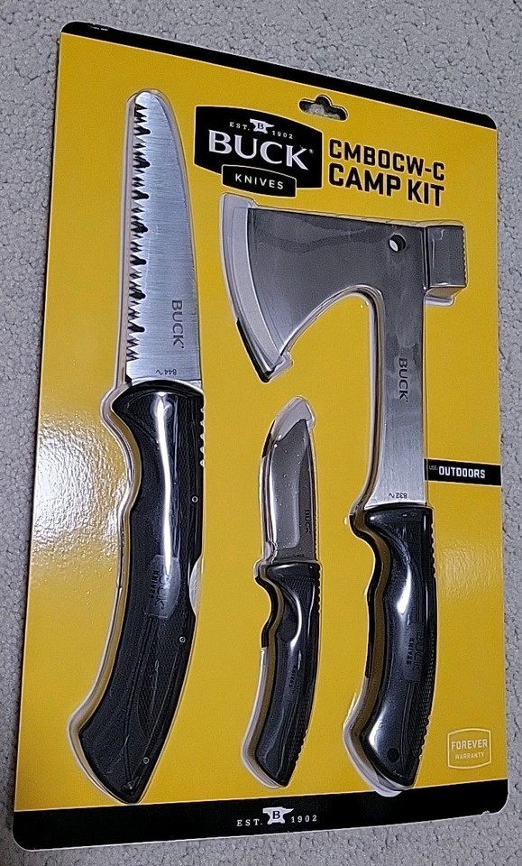 BUCK KNIFE CAMP KIT Klappsäge, feststehende Klinge Messer mit Scheide, Axt mit Scheide