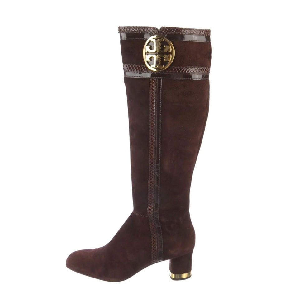 Tori Burch Gr. 7 braun gold Sabina Wildleder und Schlange hohe Reitstiefel mit Absatz