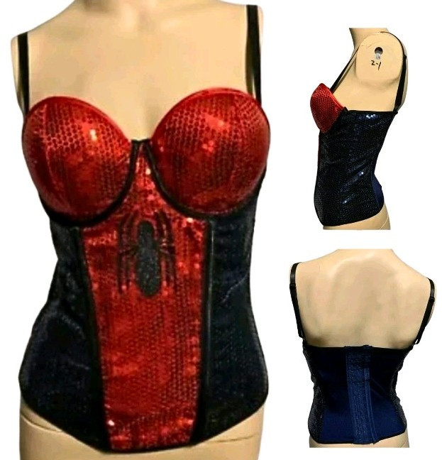 - Officially Licensed, Sequin Corset with straps, Women's S/M fits up to size 8 (US), black spider logo print, blue sequined side panels, curve-flattering fit, great for halloween and/or cosplay, hook closures in back, red sequins on the torso