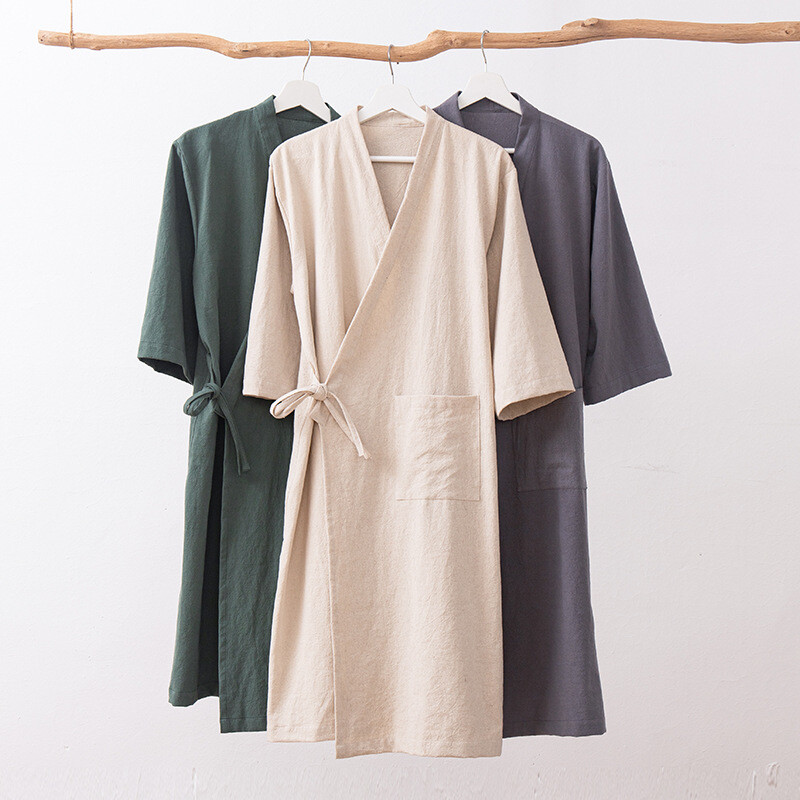 Faux Cotton Linen Chinese Long Sleeve Bathrobe Bathgown SPA Hotel Robe Cardigan