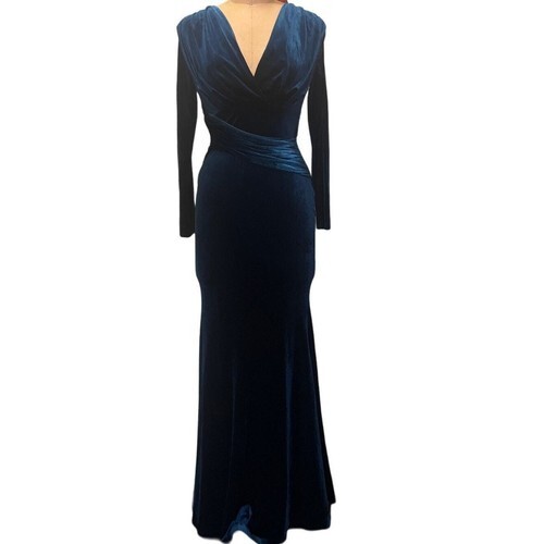 Feeriesty blau Samt gerafft V-Ausschnitt Langarm Maxikleid Kleid Gr. S