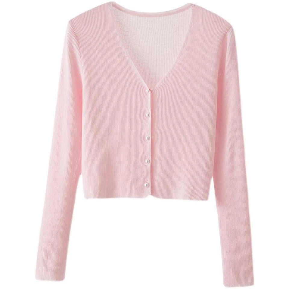 Damen Eis Seide Strick Sommer Shirt V-Ausschnitt Knopf Kurz Pullover Slim Fit Cardigan