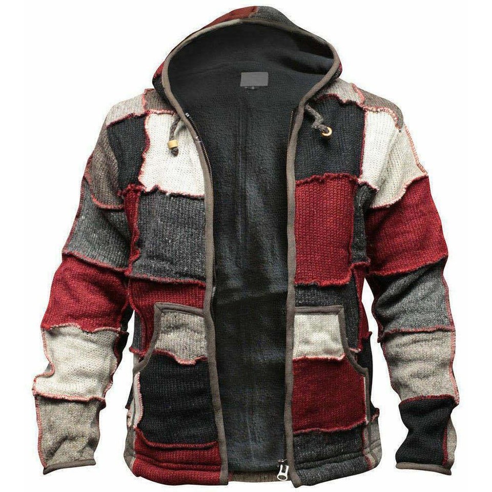 Mens Patchwork Pocket Hippy Winter WARM Zip Boho Knit Jacket Hooded Cardigan