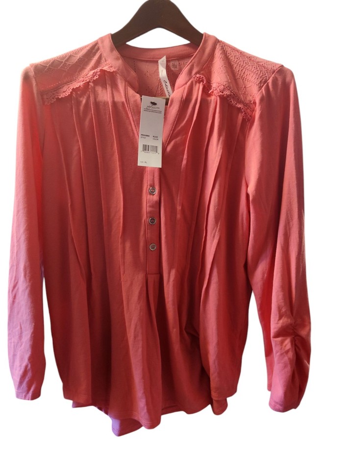 NY Collection Women's Coral Y-Neck Long Sleeve Pleat Top Petite Size L