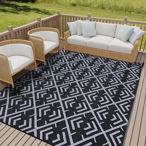 Outdoor Plastic Straw Rug, Waterproof 9' x 6' (Rectangular) Boho/Black&gre y