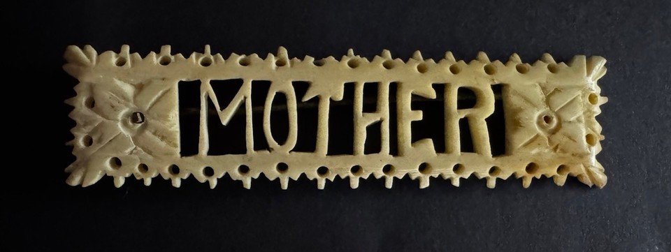 Vintage geschnitzte Zelluloid Brosche "MUTTER" *Nachlassfund*