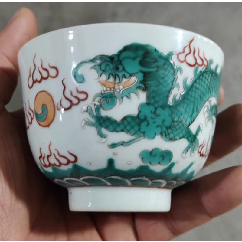 3,1 Zoll China Qing rot grün Farbe Porzellan Guan Ofen glückverheißen des Tier Drache Tasse