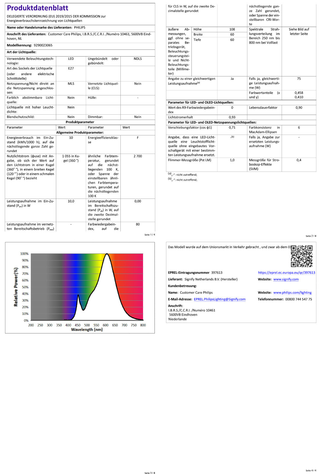 4 x Philips LED Leuchtmittel Birne A60 10W = 75W E27 matt 1055lm warmweiß 2700K