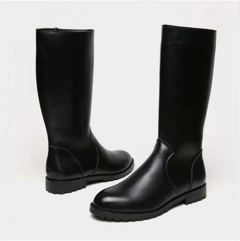 Herren Schwarz Leder Kniehoch Reitstiefel Runde Spitze Seitlicher Reißverschluss Kampfschuhe Größe