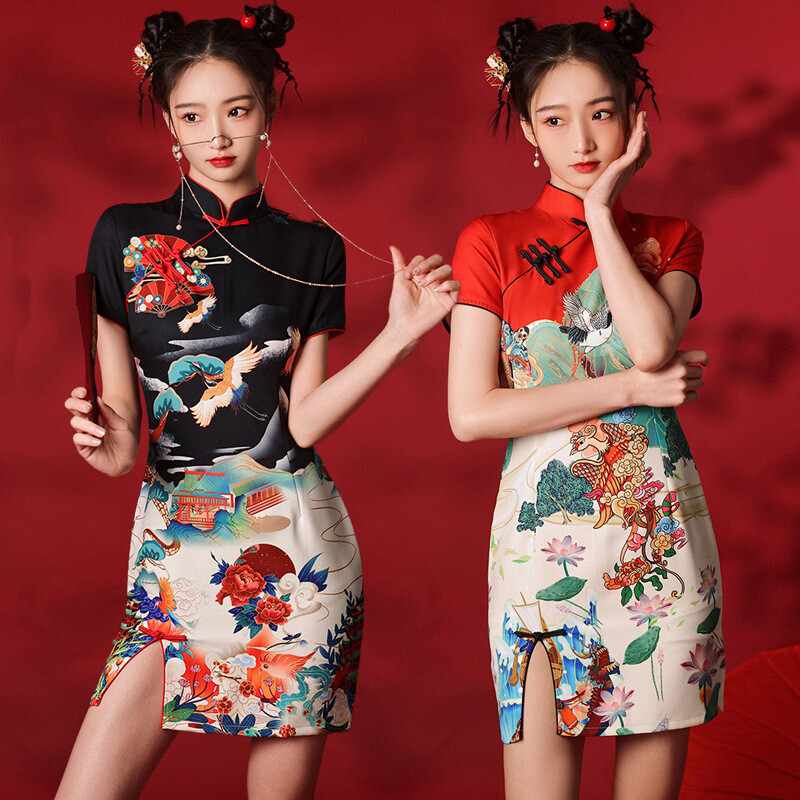 Traditionelles Cheongsam-Dame nkleid chinesisches Neujahr Froschknopf kurz Qipao-Schlitz