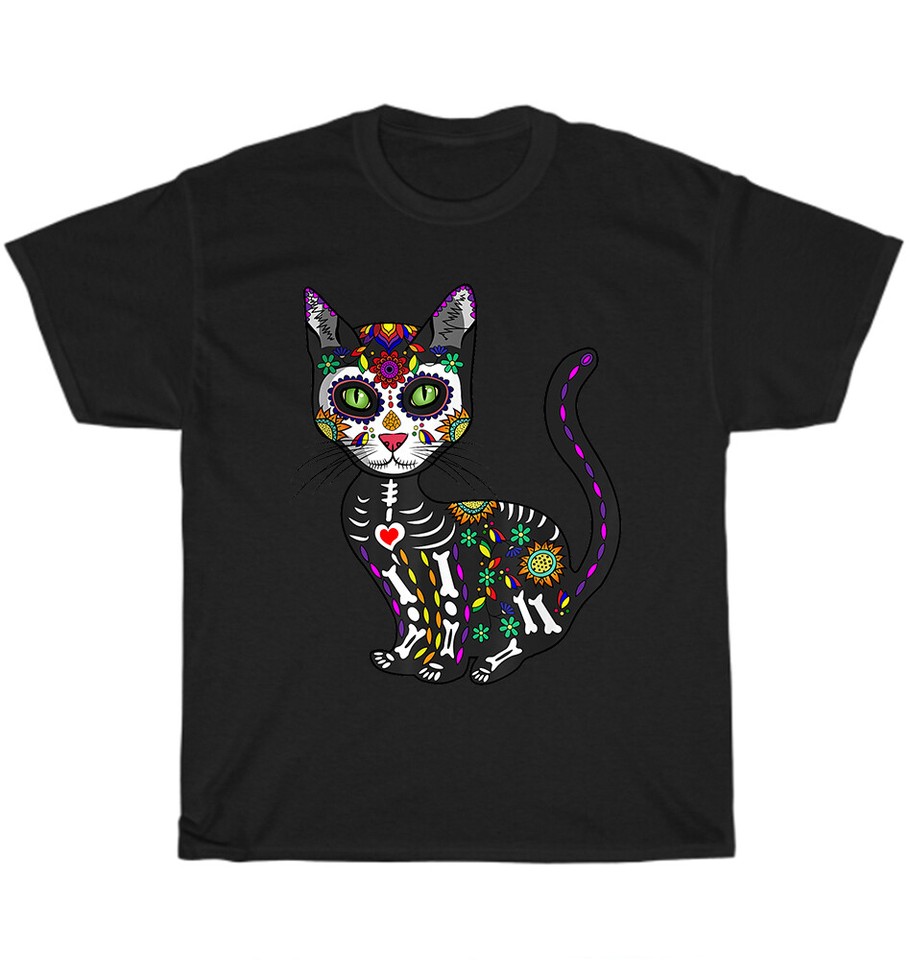 Süß Sugar Skull mexikanische Katze Halloween Tag der Toten T-Shirt Unisex Tee Geschenk
