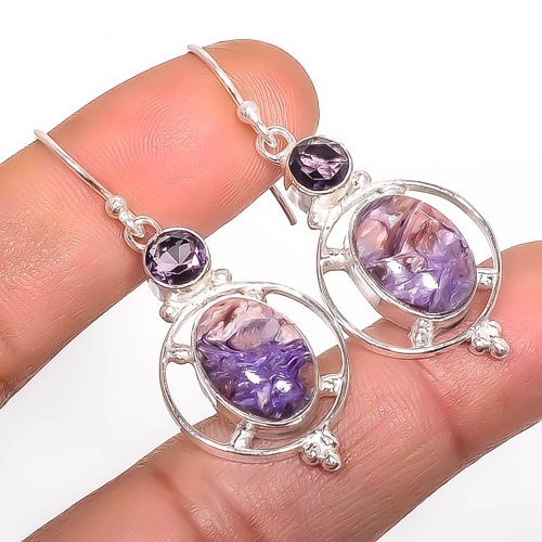 Charoit - Sibirien & Amethyst 925 Sterlingsilber Ohrring 1,87" T20