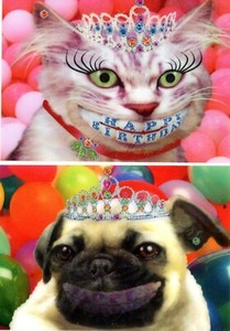 Happy Birthday lächelnde Katze & Hund - 3D linsenförmige Postkarte Grußkarte
