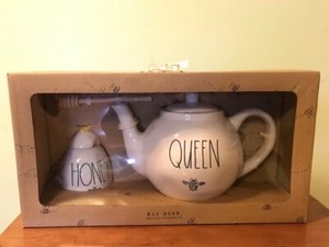 RAE DUNN BIENENKÖNIGIN Teekanne und HONIGTOPF mit gelber Biene & Holzstab (groß)