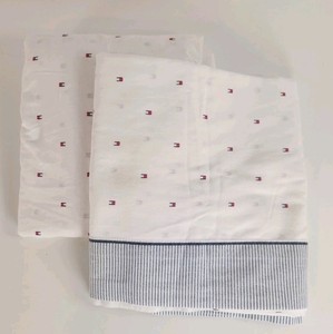 Tommy Hilfiger Standard Twin Flat Fitted Cotton Blend WhiteBlue Logo Stripe Read
