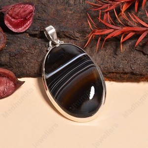 Handmade 925 Sterling Silver Pendant Black Banded Agate Statement Pendant