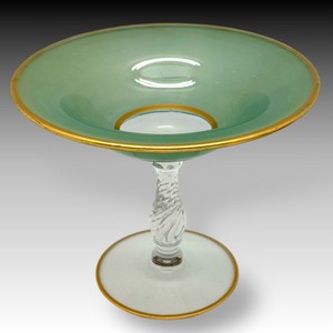 Bohemian grün Kunst Glas Kompott mit vergoldetem Rand, gedrehter Stiel, MCM Standfuß 7,25"