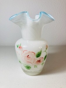 Fenton - Vintage Swirl 6" Glasvase - handbemalte Rosen gekräuselt blaues Wappen