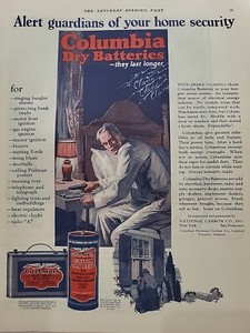 1924 Columbia Trockenbatterien S. E. Postdruck Anzeige Alarm Kurzwaffe Einbrecher Farbe