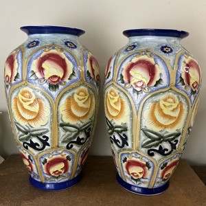 Antikes um 1900 Paar Jugendstil Majolika Vasen mit aufgesetzten Trauben, 37 cm hoch