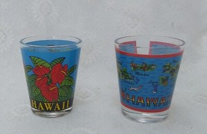 2er Set mehrfarbige Hawaii Schnapsgläser 2 3/8" hoch mit umliegenden Designs