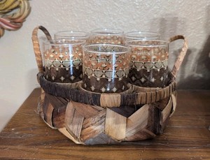 Vintage runder Rattan Getränkekorb Halter aus Korbgeflecht mit 6 braunen Design Trinkgläsern CHF 34,98