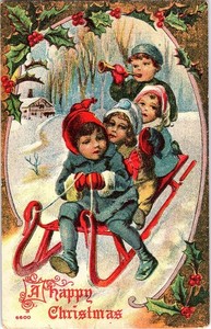 Vintage Postkarte 1900er Jahre geprägt Weihnachten mit Kindern Schlittenfahren & Stechpalme