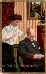 Vintage Comic Postkarte Romanze, er liebt mich - er liebt mich nicht PM 1909