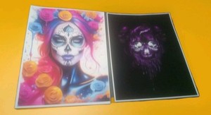2 Gothic Makabre Kunstdrucke 8,5x11" Schmelzender Totenkopf & Katzenaugen Sugar Skull Schönheit